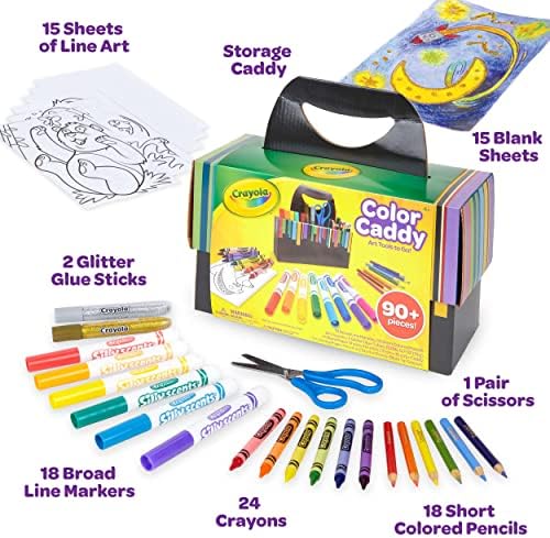 Create and craft with this huge variety of art tools that comes in a colorful caddy for easy storage and portability. The colour caddy from Crayola has everything you need to get your favorite arts and crafts started—markers, crayons, coloured pencils, scissors and more. It’s over 90 pieces of art supplies that open up a world of creative possibilities. includes 18 broad line markers, 24 crayons, 18 short coloured pencils, 1 pair of scissors, 2 glitter glue sticks, 15 sheets of line art, 15 blank sheets and storage caddy. For 4 years and up