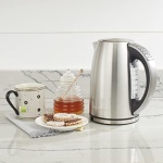 The PerfecTemp for Every Occasion Equipped with 1500 watts of power for fast heating, this electric kettle brings up to 1-2/3 liters of water to a rolling boil in a matter of minutes. Better than that, it offers six different preset heat settings, which allows for steeping tea at just the right temperature depending on the variety. Using the simple one-touch controls on the kettle’s handle, select 160 degrees F for delicate teas, 175 degrees F for green tea, 185 degrees F for white tea, 190 degrees F for oolong tea, 200 degrees F for French press coffee, and “Boil” for black tea or to make instant cocoa, oatmeal, noodles, and more. Cuisinart CPK-17 PerfecTemp Cordless Programmable Kettle The control panel also offers blue LED indicators, a “start” button, and a “keep warm” button, which will maintain the set temperature for 30 minutes. For added convenience, the kettle’s 360-degree swivel base allows for pouring without the hassle of a power cord getting in the way, and its memory function makes it possible to remove the kettle from its base for two minutes without it shutting off or losing its place in the heating process. Other highlights include a stay-cool nonslip handle, an “open” button for lifting the lid, a blue backlit water window with measurement marks, a concealed heating element to prevent mineral buildup, a removable/washable scale filter, a dripless pour spout, and boil-dry protection with auto shutoff for safety. A user manual with recipes comes included. The kettle measures approximately 8-1/5 by 9-4/5 by 12 inches and carries a three-year limited warranty. Parts and Benefits. Dripless Pour Spout with Splash Guard keeps counters dry . Removable Scale Filter for clean water . Easy-Open Lid for quick and easy filling . Lid Release Button . Preset Temperature Controls with Indicators .Delicate (160°F) .Green (175°F) .White (185°F) .Oolong (190°F) .Herbal (200°F) .Black (Boil – 212°F) .French Press (200°F) . Start (Stop) with Indicator to start/stop the heating process . Keep Warm with Indicator maintains the selected temperature for 30 minutes . Water Window for a clear view of water level . Stay-Cool Handle designed for comfort . Power Base with 360° Swivel for cordless convenience. Product Overview .1.7-liter capacity .6 preset temperatures .One-touch controls with blue LED indicators .30-minute Keep Warm option .Memory feature allows kettle to be lifted off base for 2 minutes without shutting off or losing its place in the brewing process .1500 watts for fast heat-up .Blue backlit water window .360° swivel cordless connector .Stay-cool nonslip handle .Concealed heating element to prevent mineral buildup .Removable/cleanable scale filter .Auto shutoff and boil dry protection .Limited 3-year warranty Special Features ; Memory Feature The kettle features an internal “memory” that lets you leave the kettle off the base for up to 2 minutes without it going into standby mode. When returned to the base, it will restart the heating and/or Keep Warm cycles right where they left off. Keep Warm Mode Keep Warm is the kettle’s default function that automatically maintains selected temperature for 30 minutes. If you have selected the Boil preset, your unit will hold a temperature just below boiling during the Keep Warm cycle. To bring water back to a rolling boil, press the Start button twice. Keep Warm can be turned off by pressing the Keep Warm button at any time before or during the heating cycle. ; Boil-Dry Protection Your kettle is equipped with boil-dry protection. If it starts heating without enough water in the unit, the heater will automatically shut off to avoid damaging the heating element. The lights will flash and the unit will beep to alert you. Once the kettle has cooled down, lift it off the base, then replace it to reset and restart the heating cycle. The quickest way to cool down the heater is to fill the kettle with cold water; however, you can also wait for it to cool down by itself. ; Sleep Mode If the unit is not in use for 5 minutes, it will revert to sleep mode. The heater and all lights will be off, but your last selections will remain in the unit’s memory. To turn the kettle back on, simply press any button, or lift it up and then return it to the base.