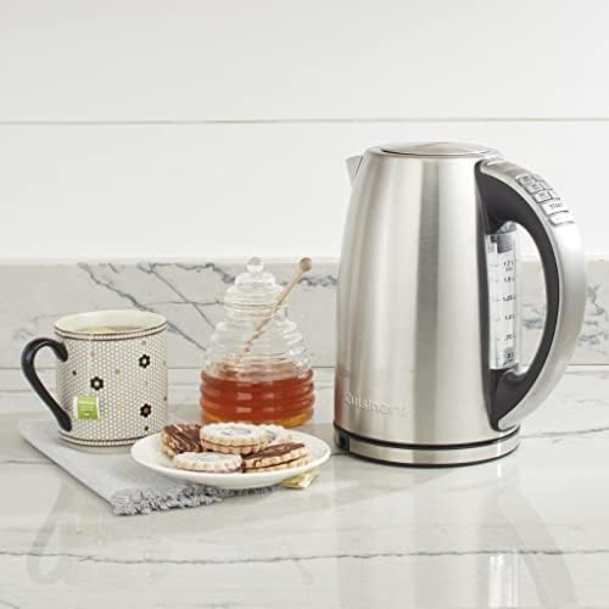The PerfecTemp for Every Occasion Equipped with 1500 watts of power for fast heating, this electric kettle brings up to 1-2/3 liters of water to a rolling boil in a matter of minutes. Better than that, it offers six different preset heat settings, which allows for steeping tea at just the right temperature depending on the variety. Using the simple one-touch controls on the kettle’s handle, select 160 degrees F for delicate teas, 175 degrees F for green tea, 185 degrees F for white tea, 190 degrees F for oolong tea, 200 degrees F for French press coffee, and “Boil” for black tea or to make instant cocoa, oatmeal, noodles, and more. Cuisinart CPK-17 PerfecTemp Cordless Programmable Kettle The control panel also offers blue LED indicators, a “start” button, and a “keep warm” button, which will maintain the set temperature for 30 minutes. For added convenience, the kettle’s 360-degree swivel base allows for pouring without the hassle of a power cord getting in the way, and its memory function makes it possible to remove the kettle from its base for two minutes without it shutting off or losing its place in the heating process. Other highlights include a stay-cool nonslip handle, an “open” button for lifting the lid, a blue backlit water window with measurement marks, a concealed heating element to prevent mineral buildup, a removable/washable scale filter, a dripless pour spout, and boil-dry protection with auto shutoff for safety. A user manual with recipes comes included. The kettle measures approximately 8-1/5 by 9-4/5 by 12 inches and carries a three-year limited warranty. Parts and Benefits. Dripless Pour Spout with Splash Guard keeps counters dry . Removable Scale Filter for clean water . Easy-Open Lid for quick and easy filling . Lid Release Button . Preset Temperature Controls with Indicators .Delicate (160°F) .Green (175°F) .White (185°F) .Oolong (190°F) .Herbal (200°F) .Black (Boil – 212°F) .French Press (200°F) . Start (Stop) with Indicator to start/stop the heating process . Keep Warm with Indicator maintains the selected temperature for 30 minutes . Water Window for a clear view of water level . Stay-Cool Handle designed for comfort . Power Base with 360° Swivel for cordless convenience. Product Overview .1.7-liter capacity .6 preset temperatures .One-touch controls with blue LED indicators .30-minute Keep Warm option .Memory feature allows kettle to be lifted off base for 2 minutes without shutting off or losing its place in the brewing process .1500 watts for fast heat-up .Blue backlit water window .360° swivel cordless connector .Stay-cool nonslip handle .Concealed heating element to prevent mineral buildup .Removable/cleanable scale filter .Auto shutoff and boil dry protection .Limited 3-year warranty Special Features ; Memory Feature The kettle features an internal “memory” that lets you leave the kettle off the base for up to 2 minutes without it going into standby mode. When returned to the base, it will restart the heating and/or Keep Warm cycles right where they left off. Keep Warm Mode Keep Warm is the kettle’s default function that automatically maintains selected temperature for 30 minutes. If you have selected the Boil preset, your unit will hold a temperature just below boiling during the Keep Warm cycle. To bring water back to a rolling boil, press the Start button twice. Keep Warm can be turned off by pressing the Keep Warm button at any time before or during the heating cycle. ; Boil-Dry Protection Your kettle is equipped with boil-dry protection. If it starts heating without enough water in the unit, the heater will automatically shut off to avoid damaging the heating element. The lights will flash and the unit will beep to alert you. Once the kettle has cooled down, lift it off the base, then replace it to reset and restart the heating cycle. The quickest way to cool down the heater is to fill the kettle with cold water; however, you can also wait for it to cool down by itself. ; Sleep Mode If the unit is not in use for 5 minutes, it will revert to sleep mode. The heater and all lights will be off, but your last selections will remain in the unit’s memory. To turn the kettle back on, simply press any button, or lift it up and then return it to the base.